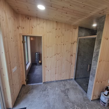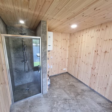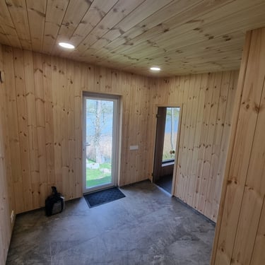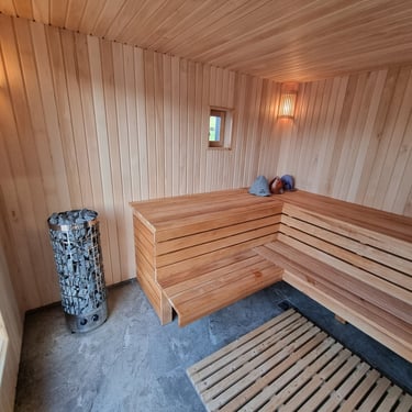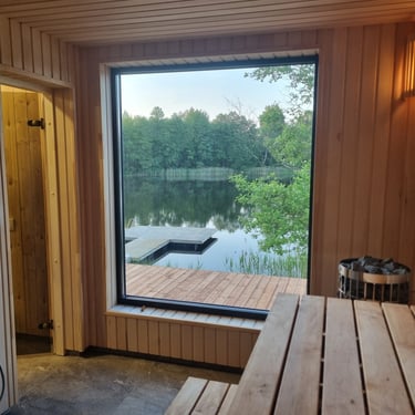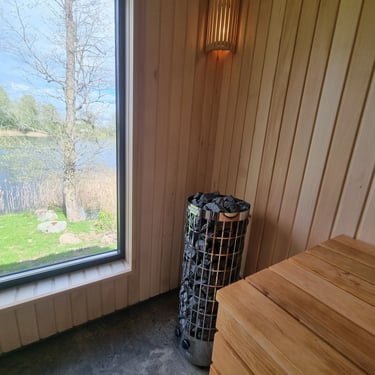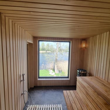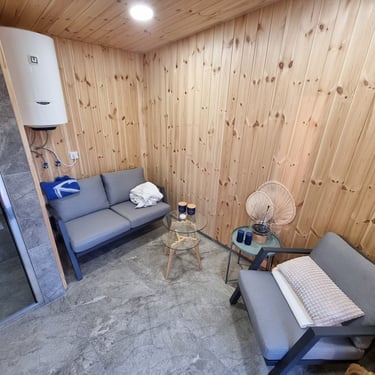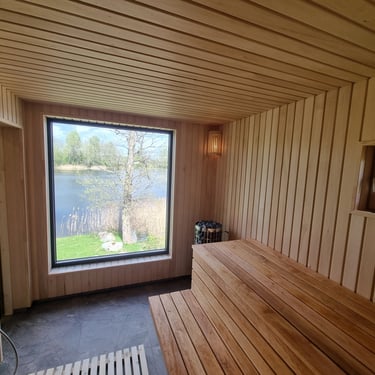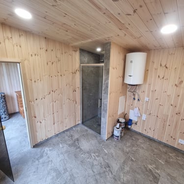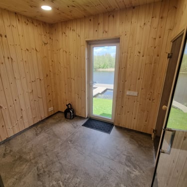 Apstatymo plotas - 21kv.m., gyvenamas plotas - 17kv.m., lubų aukštis - 2.65m . Saunos zona 3.1m x 2.1m išorės matmenys - 3.5m x 6m.