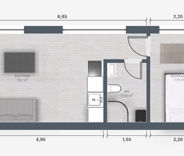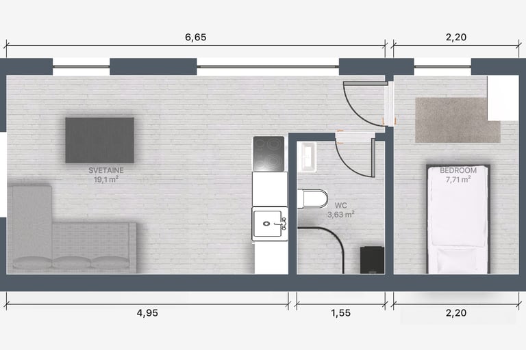 Apstatymo plotas - 40 kv.m., gyvenamas plotas - 31.5 kv. m., lubų aukštis - 2.6 m, išorės matmenys – 4.15m x 9.65m.