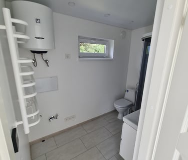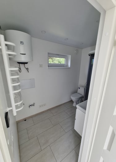 *Pilnas vonios kambarys su masažine dušo kabina, wc, praustuve, el. gyvatuku.