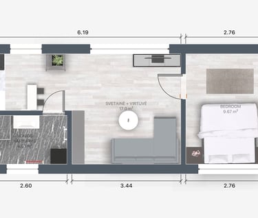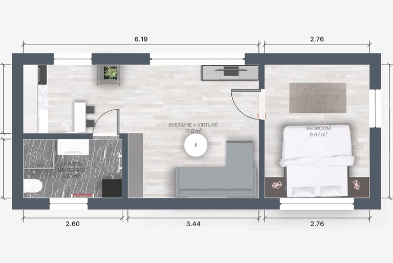 Apstatymo plotas - 40 kv.m., gyvenamas plotas - 31.5 kv.m, lubų aukštis - 2.6 m, išorės matmenys - 4.15 m x 9.65 m.