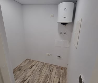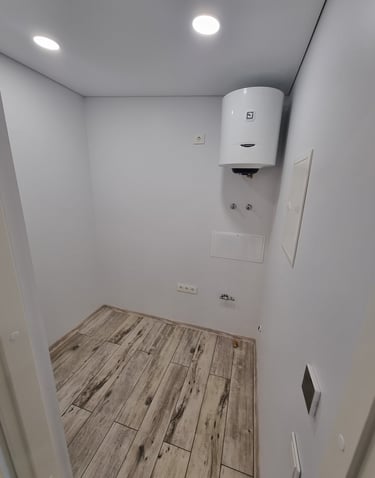 *Pilnas vonios kambarys su masažine dušo kabina, wc, praustuve, el. gyvatuku.