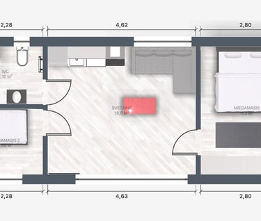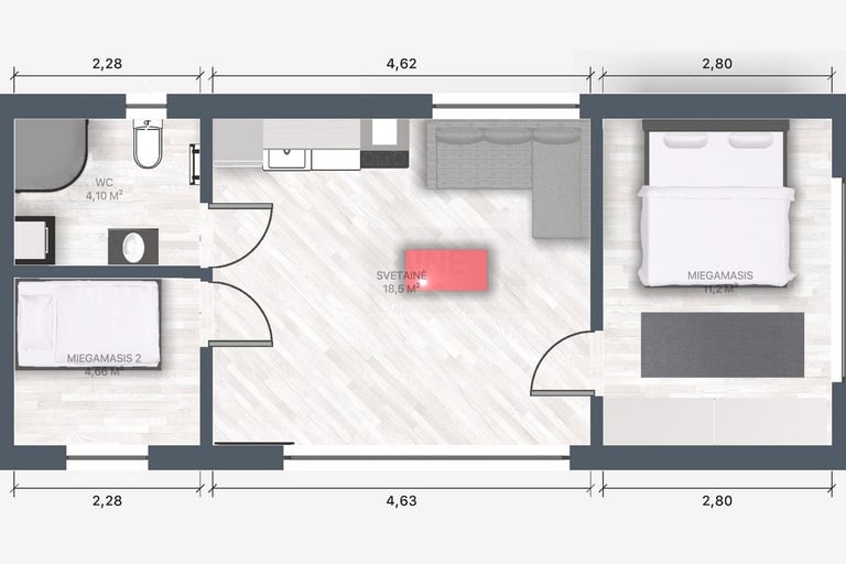 Apstatymo plotas - 50 kv.m., gyvenamas plotas - 40 kv.m., lubų aukštis - 2.65 m, išorės matmenys - 4.65 m x 10.75 m.