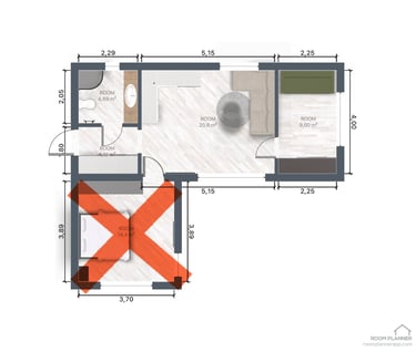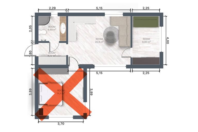 Apstatymo plotas - 50 kv.m., gyvenamas plotas - 40 kv.m., lubų aukštis - 2.65 m, išorės matmenys - 4.65 m x 10.75 m.