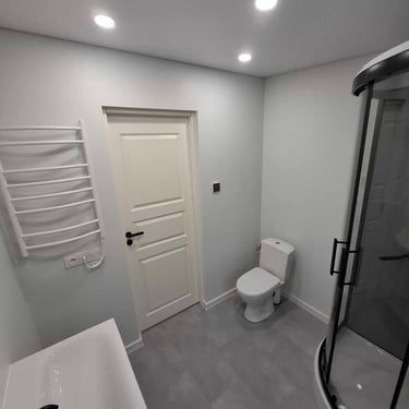 *Pilnas vonios kambarys su masažine dušo kabina, wc, praustuve, el. gyvatuku.