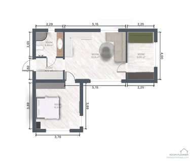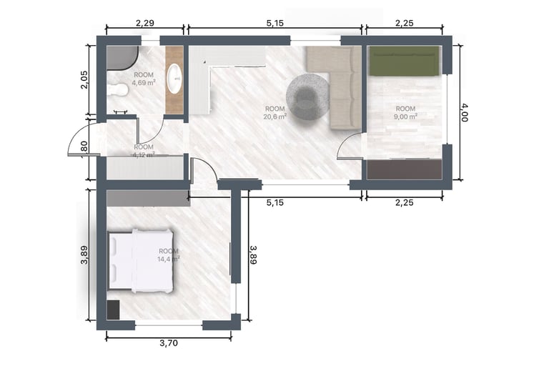 Apstatymo plotas - 70 kv.m., gyvenamas plotas - 54 kv.m., lubų aukštis - 2.65 m, išorės matmenys - 4.65 m x 10.70 m + 4.50 m x 4.3 m.