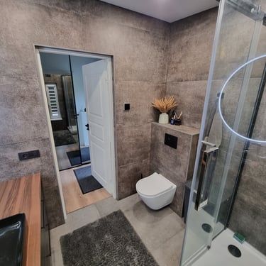 *Pilnas vonios kambarys su masažine dušo kabina, wc, praustuve, el. gyvatuku.