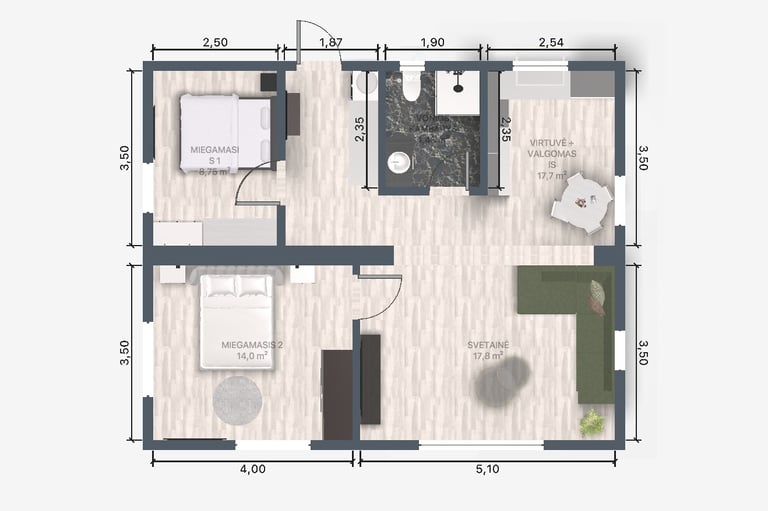 *Vidaus apdaila - dažytas dvigubas gipsas (pasirinktina spalva).