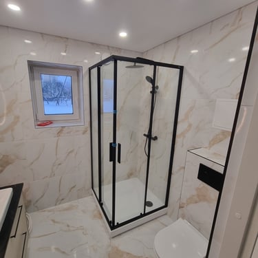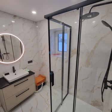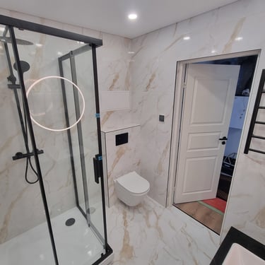 *Pilnas vonios kambarys su masažine dušo kabina, wc, praustuve, el. gyvatuku.