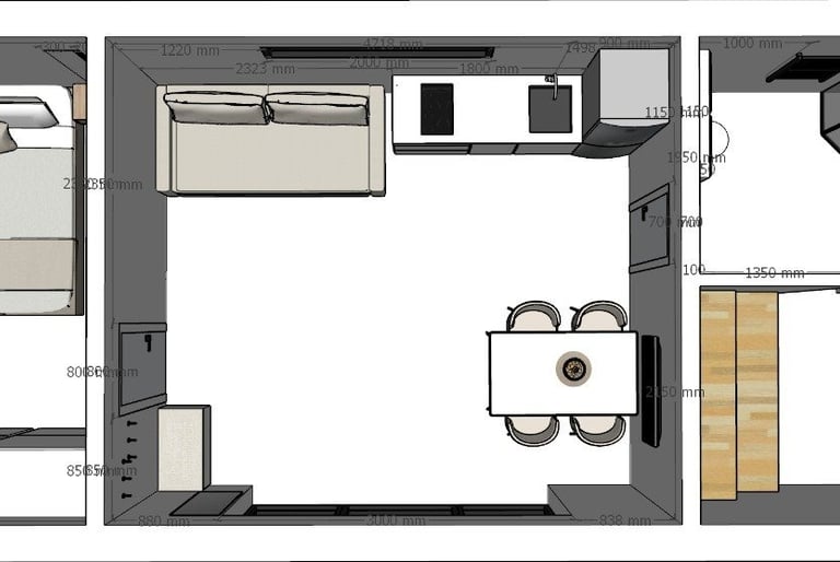 Apstatymo plotas - 50 kv.m., gyvenamas plotas - 40 kv.m., lubų aukštis - 2.65 m, išorės matmenys - 4.65 m x 10.75 m.